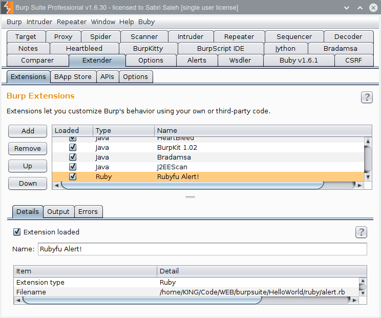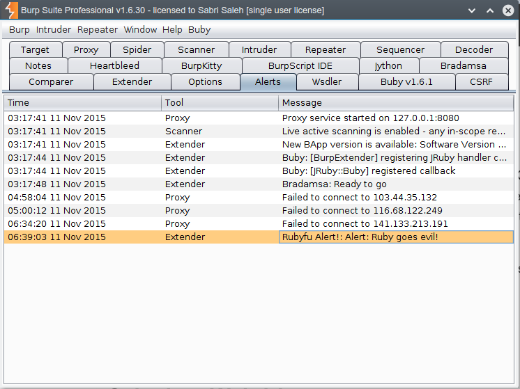 Buby is a mashup of JRuby with the popular commercial web security testing tool Burp Suite from PortSwigger. Burp is driven from and tied to JRuby with a Java extension using the BurpExtender API. This extension aims to add Ruby scriptability to Burp Suite with an interface comparable to the Burp's pure Java extension interface.