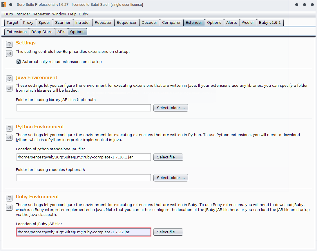 - Import the environment from Burp Suite >> Extender >> Options >> Ruby Environment.